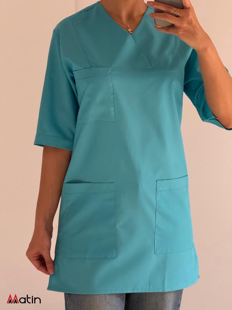 رنگی آرامشبخش برای روزهای کاری . اسکراب فیروزهای یونیسکس شیک متین با طراحی مدرن و رنگی آرامشبخش، انتخابی عالی برای پزشکان و پرستارانی است که به استایل و راحتی خود در محل کار اهمیت میدهند.رنگ فیروزهای روشن این لباس نماد آرامش و پاکیزگی است و محیط کاری را دلپذیرتر میکند. پارچه سبک و قابل تنفس آن باعث میشود حتی در طول شیفتهای طولانی، احساس خستگی یا گرما نداشته باشید.دوخت تمیز، فرم آزاد و وجود جیبهای کاربردی در جلو، این مدل را هم زیبا و هم کاملاً کاربردی کرده است.این رنگ اسکراب برای اسکین تراپیست ها و لباس مناسبی برای سالن های زیبایی است.